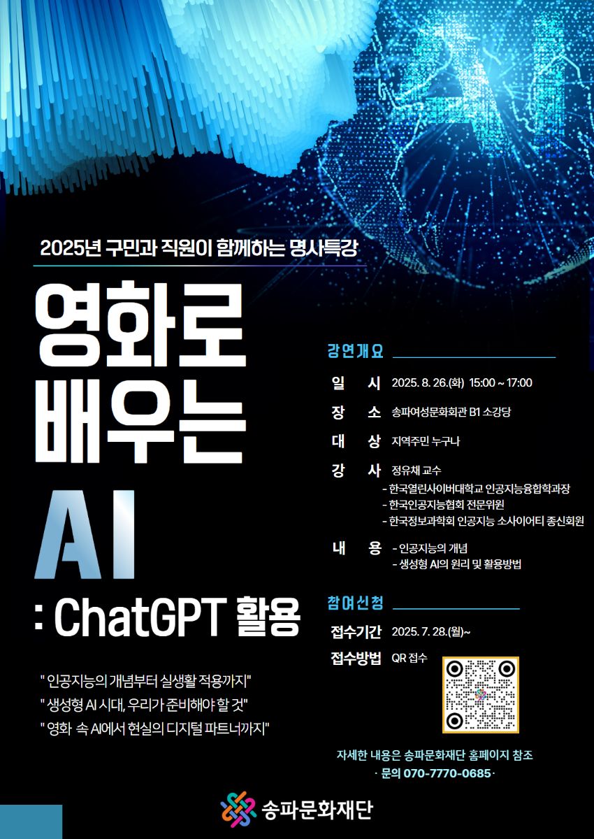 - 인공지능, 이제는 이해하고 활용하는 시대! - ![]() 무료특강에 송파구민 여러분을 초대합니다. • 일 시: 2025. 8. 26.(화) 15:00~17:00