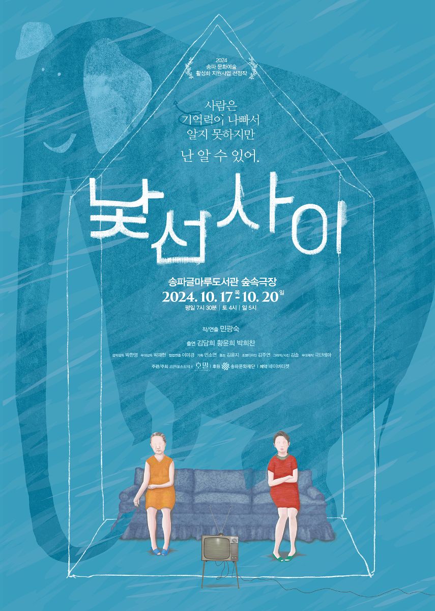 ![]() ★송파문화재단 '2024 송파 문화 예술 활성화 지원사업' 선정작 연극 <낯선사이> 안내★ ◆공연정보 ○ 일 시 : 2024.10.17.(목) ~ 10.20.(일) 목,금 19:30 / 토 16:00 / 일 17:00 ○ 장 소 : 송파글마루도서관 지하1층 숲속극장 ○ 주 관 : 공연예술창작소 호밀 ○ 후 원 : 송파문화재단 ○ 티 켓 : 무료 ○ 연 령 : 만 7세이상 ○ 예 매 : 네이버 예약 (회차별 80명 선착순 예매) ○ 장 르 : 연극 ○ 문 의 : 송파문화재단 070-4157-1356 * 네이버 예약 예매 안내사항 - 본 공연은 송파문화재단 후원으로 회차별 무료로 진행됩니다. - 회차별 선착순 예매로 진행되며 당일 노쇼를 환영하지 않습니다. - 즐거운 공연 문화를 위해 많은 분들이 공연을 관람할 수 있도록 공연 관람 불가 시 2일전까지 예매 취소를 부탁드립니다. ◆공연내용 정순은 3개월 시한부 인생이라는 고백으로 딸 해수는 정숙의 집에서 엄마의 물건을 하나씩 정리하며 정숙과 일상을 보내고 있다. 정숙은 30년 전 잃어 버린 아들에 대한 그리움으로 해수에게 죽기 전 소원이라며 아들 상준이를 다시 찾아 보자고 말을 한다. 삶의 마지막 순간까지 상준이만 생각하는 정순의 모습에 딸은 어린시절부터 억눌렀던 감정이 표출되면서 정숙과 대립하고 곪아 있던 상처들이 하나 둘 끄집어 내서 서로 더 큰 상처를 주게 된다 반복 되는 일상을 살아가는 어느 날 예상치 못한 전화 한통이 걸려오고 정순의 집안에 공기를 바꾸게 되는데… ◆기획의도 ○ 작/연출|민광숙 ○ 배우|김담희 황윤희 박희찬 ○ 음악감독|박한영 ○ 무대감독|박재현 ○ 조명디자인|김주연 ○ 협력연출|이미경 ○ 기획| 민소연 ○ 홍보|김윤지 ○ 그래픽/사진|김솔 ○ 무대제작|극단 레마 2014년 연극 <로망>을 시작으로 <빛과 어둠 사이에서> <언필과지우개> <안녕하세요 쉐어하우스입니다> <햄릿광대 난장> 뮤지컬<버드아이> 음악극 <독백콘서트> 소리컬 <몬스터할아방> <하늘 땅 바다 그리고 별> 등 다수의 창작극을 통해 연극적 언어를 개발하고 관객에게 깊이 있는 공감을 전달하고자 합니다. 더 나아가 성, 연령, 배경지식, 장애 등에 상관없이 함께 즐길 수 있는 공연을 기획, 창제작 운영합니다. ※ 공연 방문 시 대중교통을 이용해 주세요. ※ 원활한 공연 진행과 건강한 관람문화를 위해 예매 후 당일 취소 (노쇼) 지양에 협조 부탁드립니다. ※ 본 공연은 송파구 예술인들의 창작활동을 지원하기 위한 송파문화재단 '송파 문화예술 활성화 지원사업'의 일환으로 진행됩니다. ※ 공연일에 오셔서 송파구 문화예술인의 창작활동에 많은 응원 부탁드립니다.