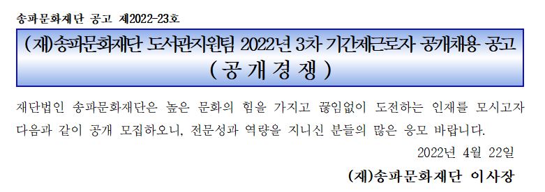 (재)송파문화재단 도서관지원팀 2022년 3차 기간제근로자 공개채용 공고